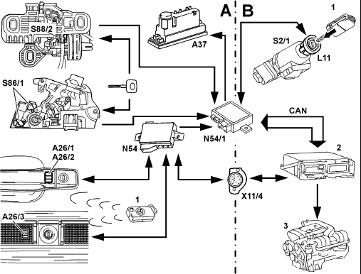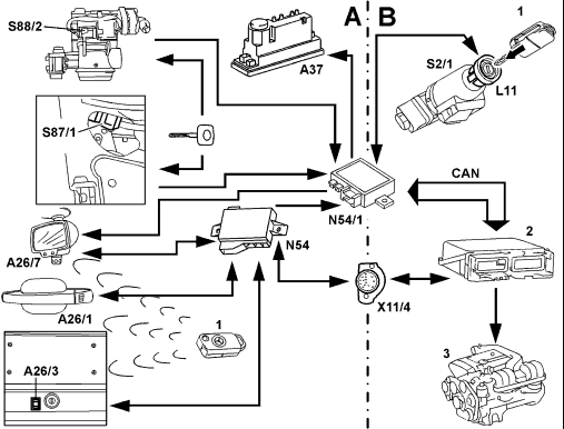 A Infrared remote control for central locking (RCL) B Drive authorization stage X (engine control release via transponder) A26/1 Left front door IR receiver A26/2 Right front door IR receiver A26/3 Trunk lid IR receiver A37 PSE control module CAN Controller area network L11 Transponder coil N54 RCL control module N54/1 IR DAS control module S2/1 Ignition/starter switch S86/1 Left front door lock switch S88/2 Trunk lid lock switch (CF) X11/4 Data link connector (DTC readout) 1 IR remote control key with transponder 2 Engine control module 3 Engine |