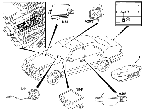 - Three infrared receivers: front left door, front right door, trunk lid (W129/140), interior rearview mirror (W202/210) - Infrared RCL control module |