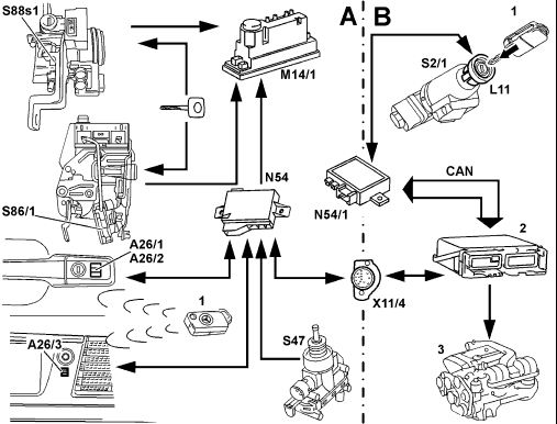 A Infrared remote control for central locking (RCL) B Drive authorization stage X (engine control release via transponder) A26/1 Left front door IR receiver A26/2 Right front door IR receiver A26/3 Trunk lid IR receiver CAN Controller area network L11 Transponder coil N54 RCL control module N54/1 IR DAS control module M14/1 Supply pump (CL) S2/1 Ignition/starter switch S86/1 Left front door lock switch S88s1 ATA/CF microswitch X11/4 Data link connector (DTC readout) 1 IR remote control key with transponder 2 Engine control module 3 Engine |