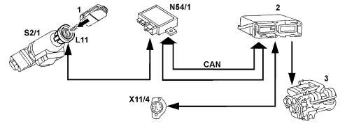 A Infrared remote control for central locking (RCL) B Drive authorization stage X (engine control release via transponder) A26/1 Left front door IR receiver A26/2 Right front door IR receiver A26/3 Trunk lid IR receiver CAN Controller area network L11 Transponder coil N54 RCL control module N54/1 IR DAS control module M14/1 Supply pump (CL) S2/1 Ignition/starter switch S86/1 Left front door lock switch S88s1 ATA/CF microswitch X11/4 Data link connector (DTC readout) 1 IR remote control key with transponder 2 Engine control module 3 Engine |