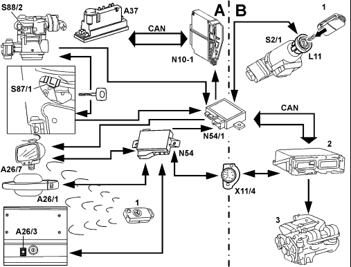A Infrared remote control for central locking (RCL) B Drive authorization stage X (engine control release via transponder) A26/1 Left front door IR receiver A26/2 Right front door IR receiver A26/3 Trunk lid IR receiver A37 PSE control module CAN Controller area network L11 Transponder coil N54 RCL control module N54/1 IR DAS control module S2/1 Ignition/starter switch S86/1 Left front door lock switch S88/2 Trunk lid lock switch (CF) X11/4 Data link connector (DTC readout) 1 IR remote control key with transponder 2 Engine control module 3 Engine |