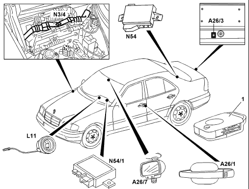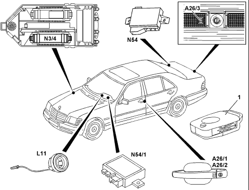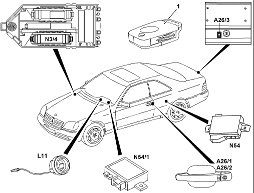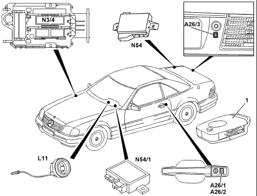 - Three infrared receivers: front left door, front right door, trunk lid (W129/140), interior rearview mirror (W202/210) - Infrared RCL control module |