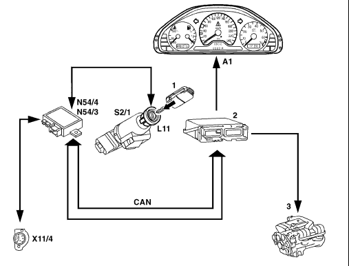 A1 Instrument cluster CAN Controller area network L11 Transponder coil N54/3 Radio frequency DAS control module (model 170) N54/4 Radio frequency/infrared DAS control module (models 129, 140) S2/1 Ignition/starter switch X11/4 Data link connector 1 Radio frequency/infrared remote control key with transponder 2 Engine control module 3 Engine |