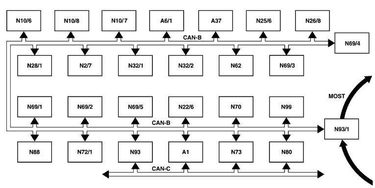 The following control units form the interface between the bus systems: The central gateway control unit (N93) connects the CAN-B and the CAN-C.
