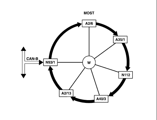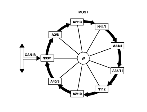 W Wake-up line A2/6 CD player with changer (in trunk) A2/10 TV tuner (MOST) A2/13 Sound amplifier A34/4 Cell phone interface A35/11 Voice recognition system control unit A40/3 COMAND operating, display and control unit N41/1 Navigation processor N93/1 Audio gateway control unit N112 Telecommunications control unit |