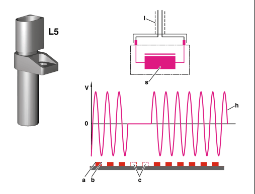 L5 Crankshaft position sensor a Tooth leading edge b Tooth trailing edge c Gap (2 teeth missing) h Signal of crankshaft position sensor l Screened signal line s Coil (inductive) The front edge of a tooth (a) generates a positive voltage pulse and the rear edge (b) a negative voltage pulse. The distance from the positive to the negative voltage peak equals the length of a tooth. The gap (c) produced by 2 missing teeth results in no voltage being generated in the crankshaft position sensor. This gap is used to recognize the top dead center position of cylinders 1 and 6. |
