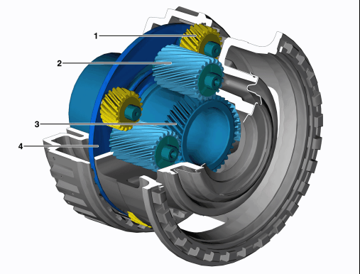 1 Short planet gear 2 Long planet gear 3 Sun gear 4 Planet carrier |