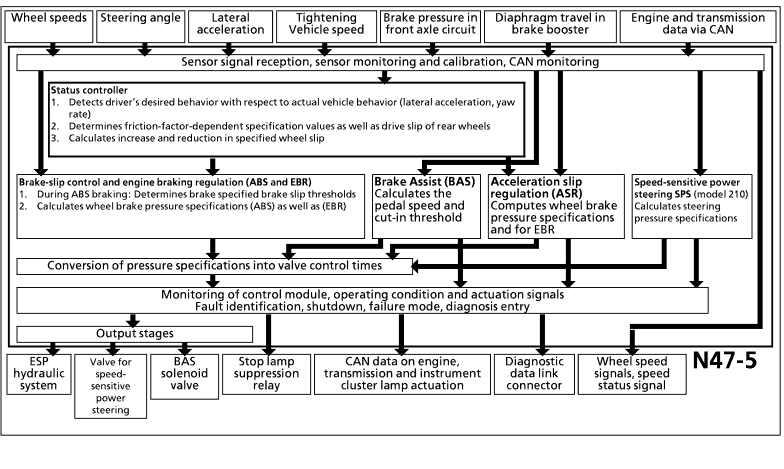 - Signal from stop lamp switch - Signal from parking brake switch (models 203, 215, 220 over CAN) - ESP OFF switch signal (models 203, 215, 220 over CAN) - Signal from BAS release switch - Signal from BAS diaphragm travel sensor Function logic component The conditioned input signals are processed in the logic component and converted into output signals. Wheel speed sensor signals: