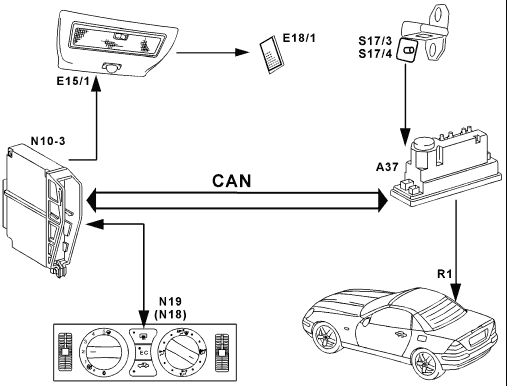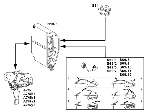 A7/5b1 Overload protection thermocouple A7/5k1 Relay A7/5y1 Vario-roof solenoid valve A75y2 Trunk lid cylinder N10-3 Multi-function control module S69/1 Vario-roof "closed" limit switch (right lug) S69/2 Vario-roof "locked" limit switch (right rotary tumbler) S69/3 Vario-roof "locked" limit switch (left rotary tumbler) S69/7 Left trunk lid "closed/locked" limit switch S69/8 Right trunk lid "closed/locked" limit switch S69/9 Trunk lid "open" limit switch S69/10 Trunk partition "closed" limit switch S69/11 Vario-roof "open/lowered" limit switch S69/12 Trunk lid rotary tumbler/trunk lamp toggle switch S84 Vario-roof switch |