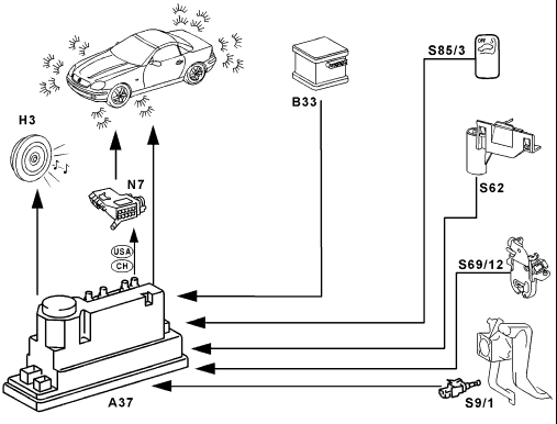B33 ATA inclination sensor H3 Alarm horn N7 Exterior lamp failure monitoring module S9/1 Stop lamp switch (4-pin) S62 Engine hood switch (ATA) S69/11 Vario-roof "open/lowered" limit switch S85/3 ATA status/towing protection switch |